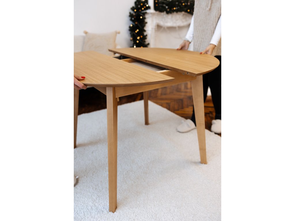 Stůl Mars D1000+375 nabízí flexibilitu a moderní vzhled v jednom. Základní kulatá deska o průměru 1000 mm je vyrobena z MDF s dubovou dýhou, která spojuje snadnou údržbu s přirozenou estetikou dřeva. Díky vloženému dílu o šířce 375 mm lze stůl rychle zvětšit, což ocení gastro provozy, hotelové restaurace nebo domácnosti při slavnostních příležitostech. Stabilní podnož z bukového masivu zajišťuje vysokou pevnost a dlouhou životnost.